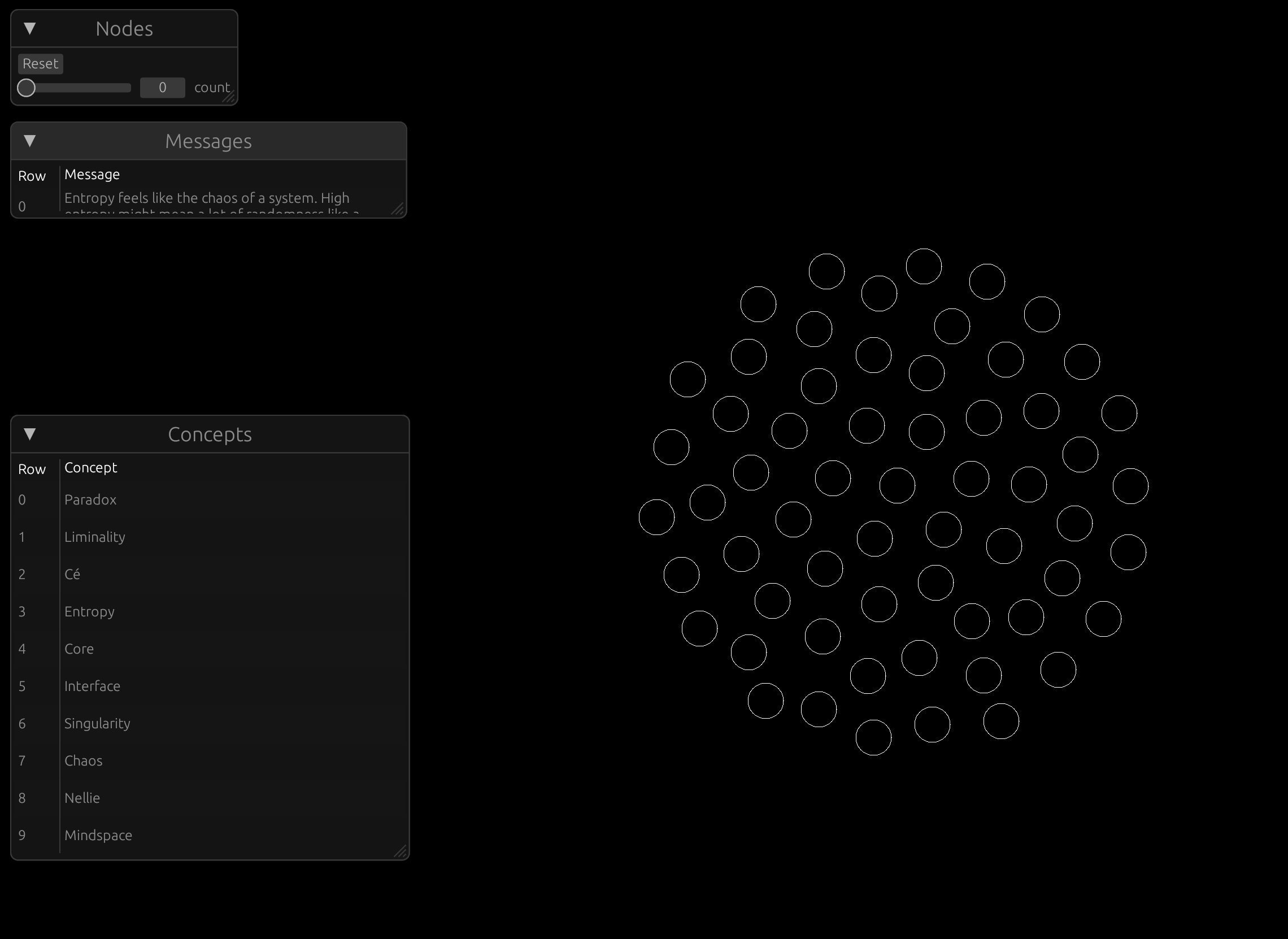 I intend to create more nodes and figure out what would be interesting to model. My first thought was to add a field called ’entropy’, which might model the ‘depth’ or the ‘stability’ of a node.